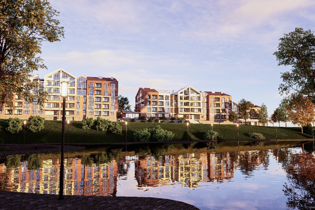 The complex includes a swimming pool, a tennis court, a kindergarten, a racetrack 50 meters away, a natural lake with fishing opportunities, and bike paths.