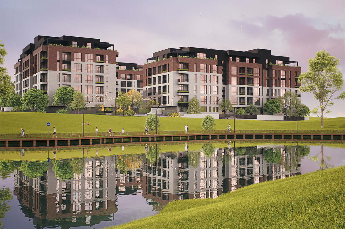 The complex includes a swimming pool, a tennis court, a kindergarten, a racetrack 50 meters away, a natural lake with fishing opportunities, and bike paths.